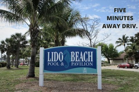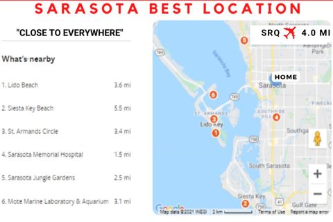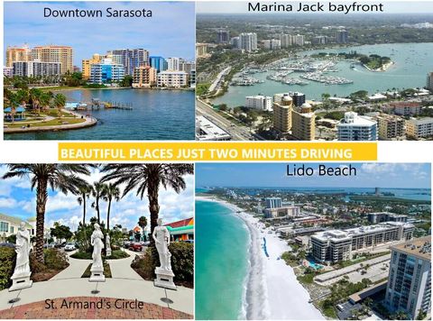 Nearby attractions: Lido Beach (5 min), Siesta Key Beach (10 min), St. Armand's Circle, Sarasota Bay, Van Wezel Auditorium, Ringling Museum, Marie Selby Botanical Gardens, Payne Park, and Marina Jack Bayfront.